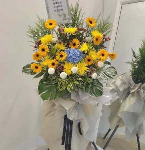 菊花、太阳花、绣球、散尾叶等组合,单层白事花篮<殡葬花篮>